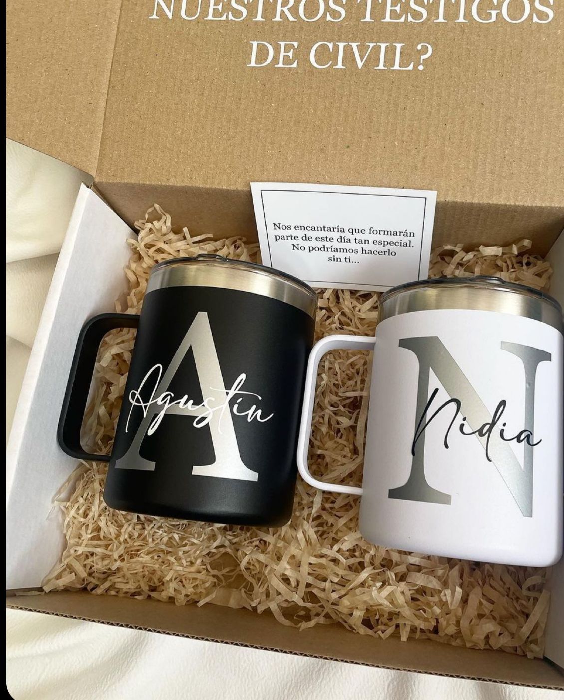 Paquete 4: dos termos personalizados en caja de madera con tapa transparente.